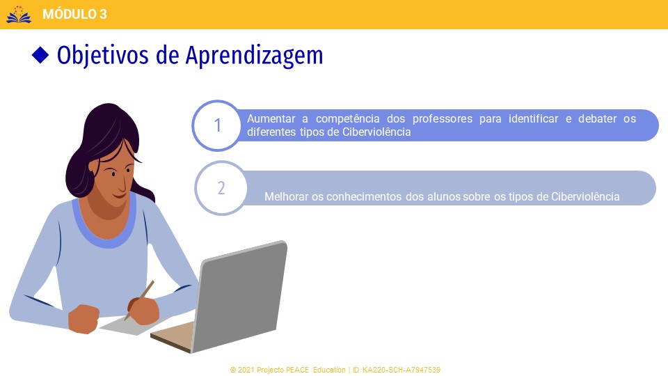 - Neste módulo, os professores serão capazes de identificar diferentes tipos de Ciberviolência e os alunos familiarizar-se-ão com tipos específicos de violência, incluindo a violência entre parceiros íntimos, o suicídio, a violência sexual, a violência juvenil, incluindo o ciberbullying, os maus-tratos a crianças, os maus-tratos a idosos e a violência de gangues.