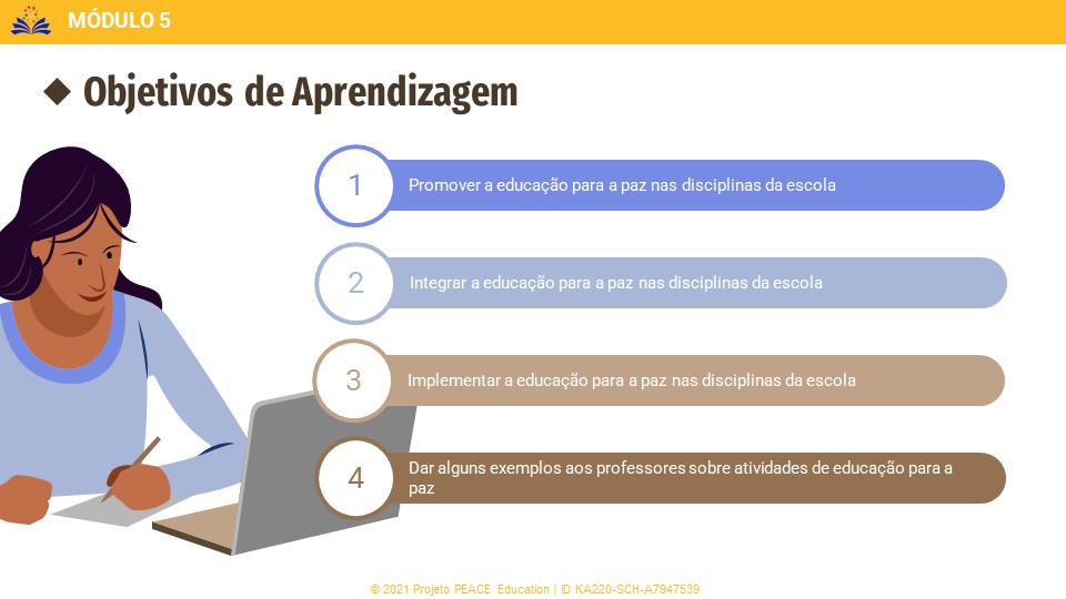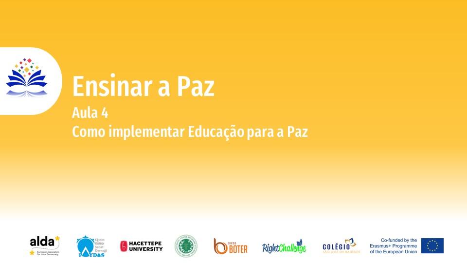 Os objetivos de aprendizagem da aula são promover, envolver e implementar a educação para a paz nas disciplinas da escola e também dar alguns exemplos aos professores sobre atividades de educação para a paz.