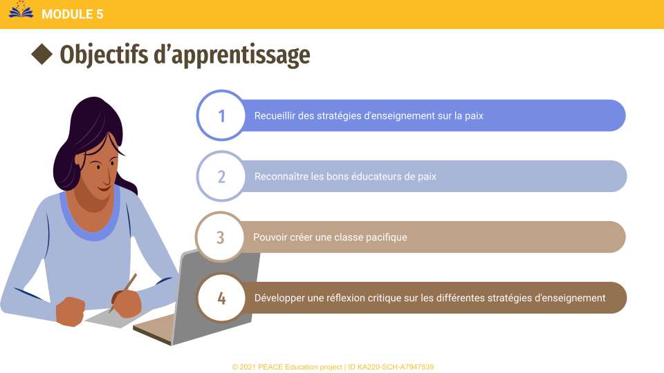 Les objectifs d'apprentissage de la leçon sont de rassembler des stratégies d'enseignement sur la paix, de reconnaître les bons éducateurs pour la paix, d'être en mesure de créer une classe pacifique et de partager ces connaissances en dehors de la classe, ainsi que de développer une pensée critique sur les différentes stratégies d'enseignement.