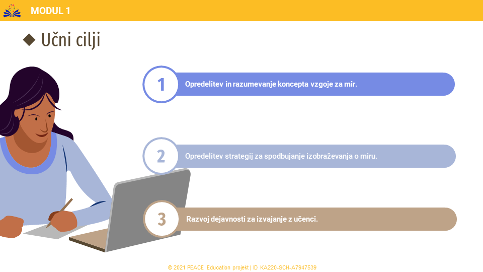 Glavni učni cilji so znati opredeliti in razumeti vzgojo za mir, opredeliti strategije za njeno spodbujanje ter razviti dejavnosti za njeno izvajanje z učenci.